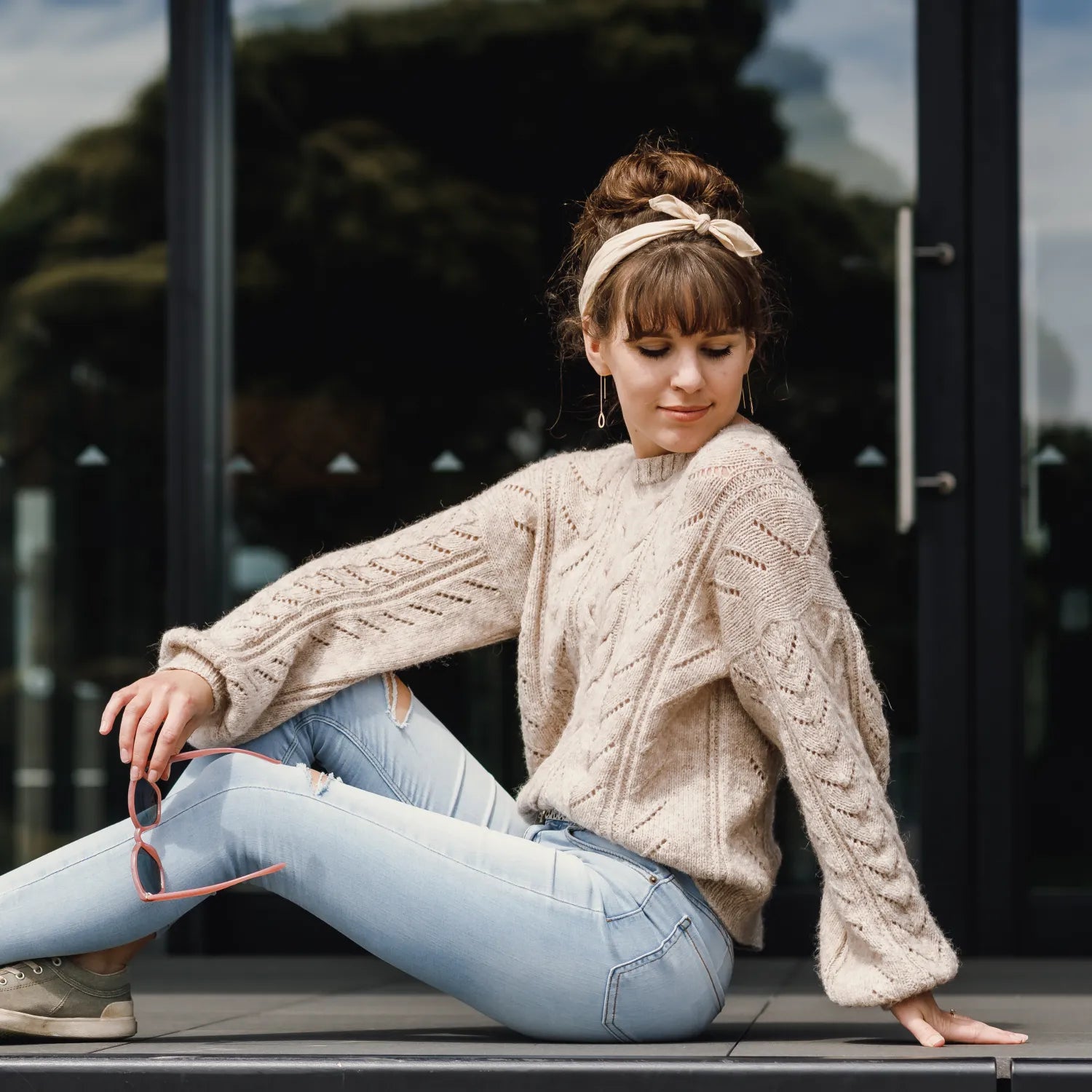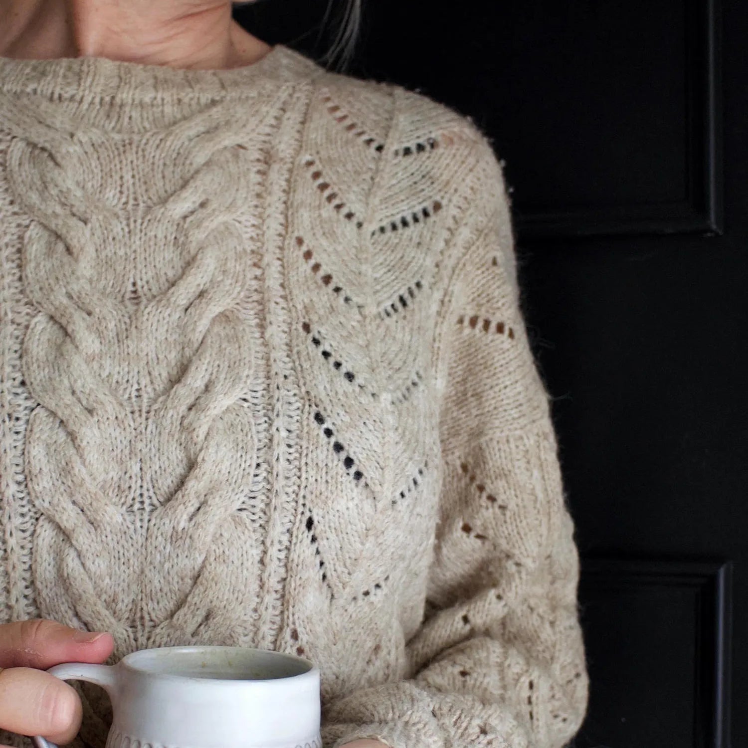 Get cozy in the Cable Bay Sweater, inspired by the serene inlet of the same name. Featuring a delicate balance of eyelet stitches and wide cables, paired with drop shoulders, balloon sleeves, and a relaxed fit, this sweater is perfect for any casual occasion.
